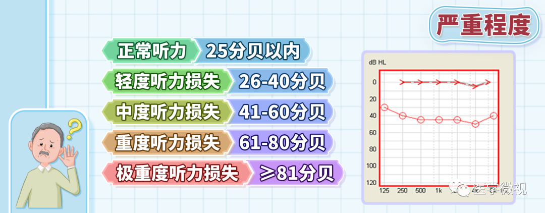 听力下降的严重程度,根据听阈(人能听到的最小声音强度)范围,可以分为轻、中、重、极重四个等级。(声音参考:说悄悄话的声音约为30分贝,正常交谈的声音约65分贝)