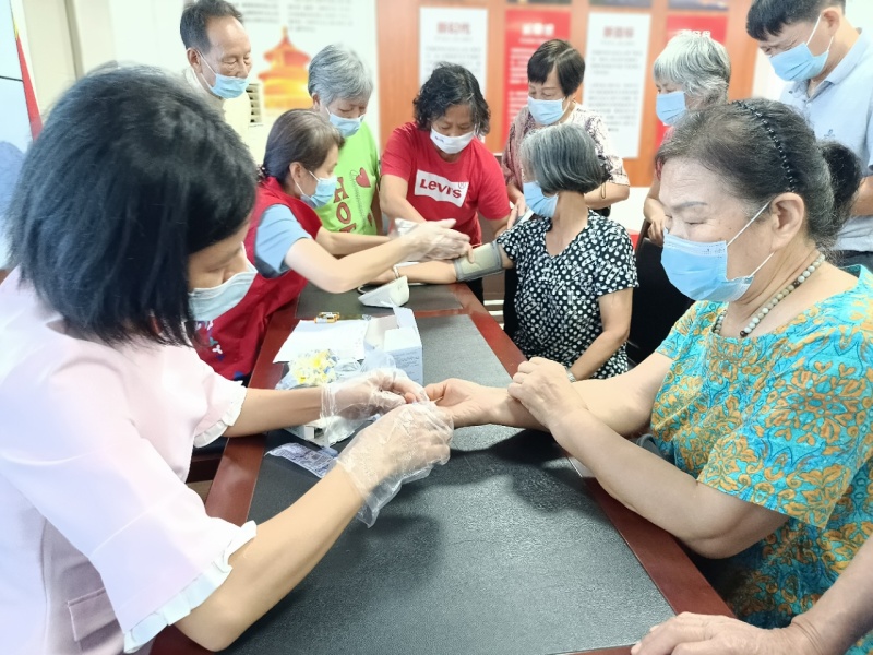 在义诊现场,蔡医生为长者量血压、测血糖、耐心解答长者们有关疾病的咨询。60多岁的陈阿姨说:“我患有高血压多年,原来也有相关的保健操,这活动确实很实用,在家门口就能学习到养生知识,享受便民检查和健康咨询服务,谢谢你们。”