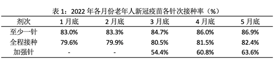 为形成有效防护,老年人全程接种率估计需要提升至90-95%,且最好在今年秋冬季之前(即10月前)完成目标,一旦错过窗口期(即6-9月),进入秋冬季将是疫情高发期。但是从今年1月底至5月底,老年人全程接种率增长约2.8个百分点,平均每月仅0.7个百分点;加强针接种进程较快,3月到5月底增长了9.2个百分点。但从进展速度看,各针次的增长速度从5月起已变慢。按照目前的推进速度,难以在秋冬季之前完成90-95%全程接种率,且接种工作越往后越难,因为越往后待接种的越是高年龄或合并基础疾病的老年人,这部分人群的动员工作将更难开展。另外,目前完成第一针或全程接种的老年人,半年后加强针接种仍将面临困难。