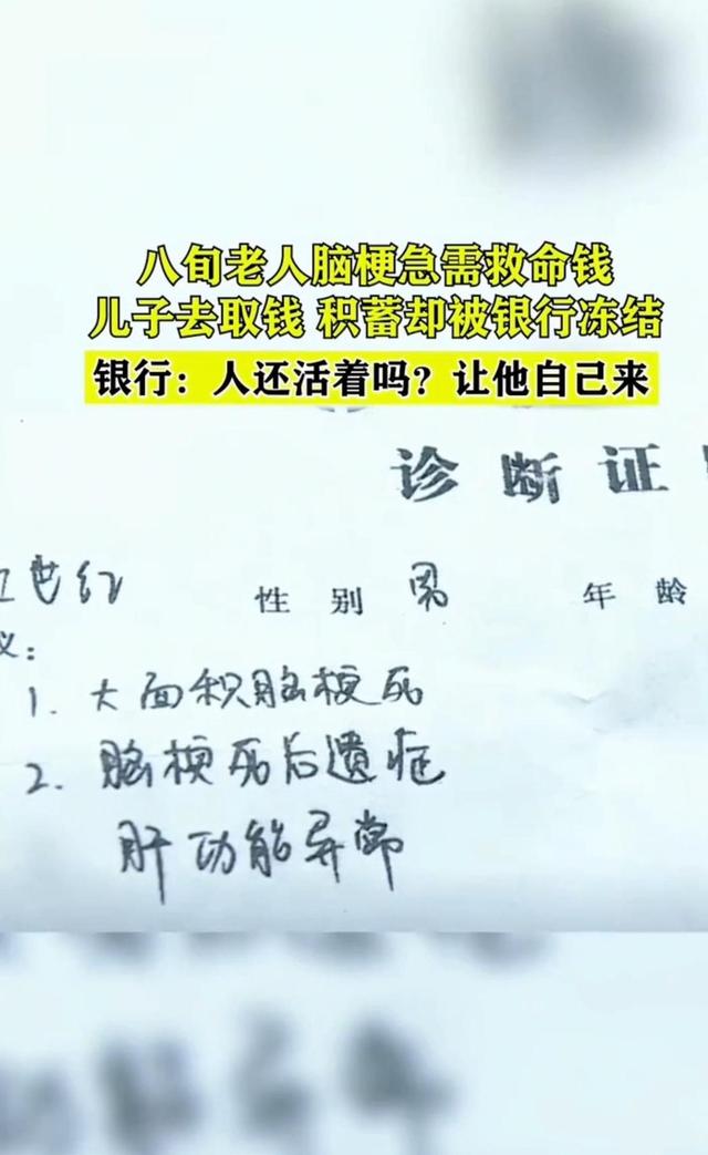 某地一八旬老人脑梗病重,急需救命线,老人儿子来取钱,银行拒绝,并让危在旦夕的老人自己来取钱,而且冻结存款,并让据出各种奇证明。