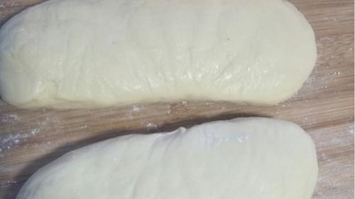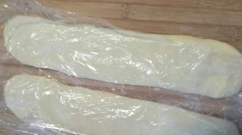 第二天取出回温半小时,案板上撒少许面粉防粘,不要揉面,按成细长面片,拍掉两侧气泡。