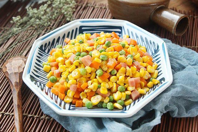 【食材】:甜玉米 适量、胡萝卜 适量、青豆 适量、蚝油 1勺、火腿肠 35克、盐 1小勺、糖 1小勺