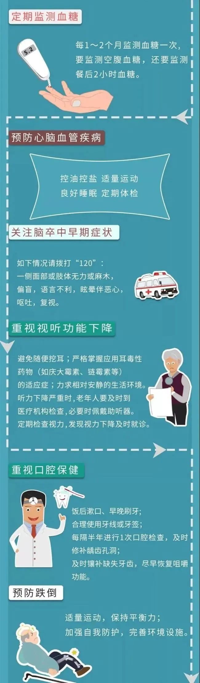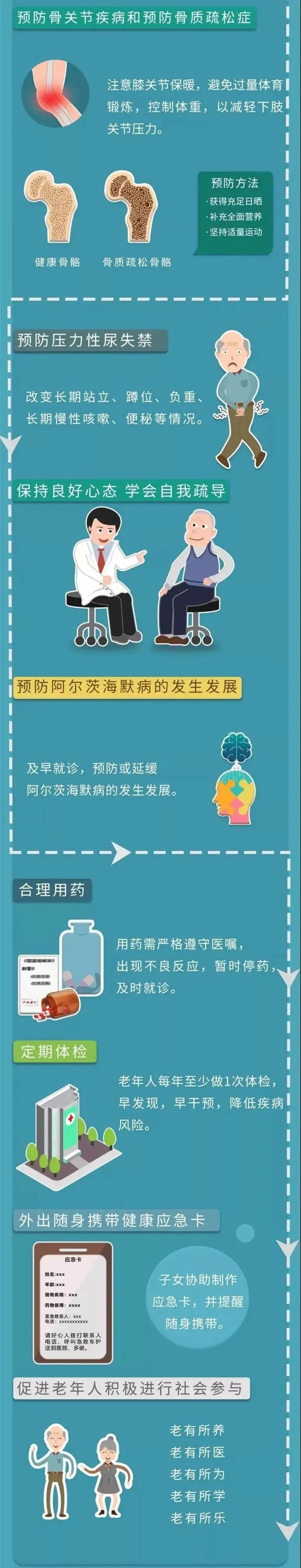 4.进行健康生活方式以及疫苗接种、骨质疏松预防、防跌倒措施、意外伤害预防和自救、认知和情感等健康指导。