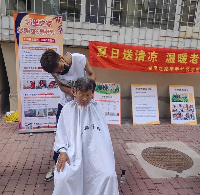 7月12日上午,长春市永昌街道义和社区联合辖区养老服务机构邻里之家开展“夏日送清凉,温暖老人心”义务理发活动,为辖区内老人义务理发。