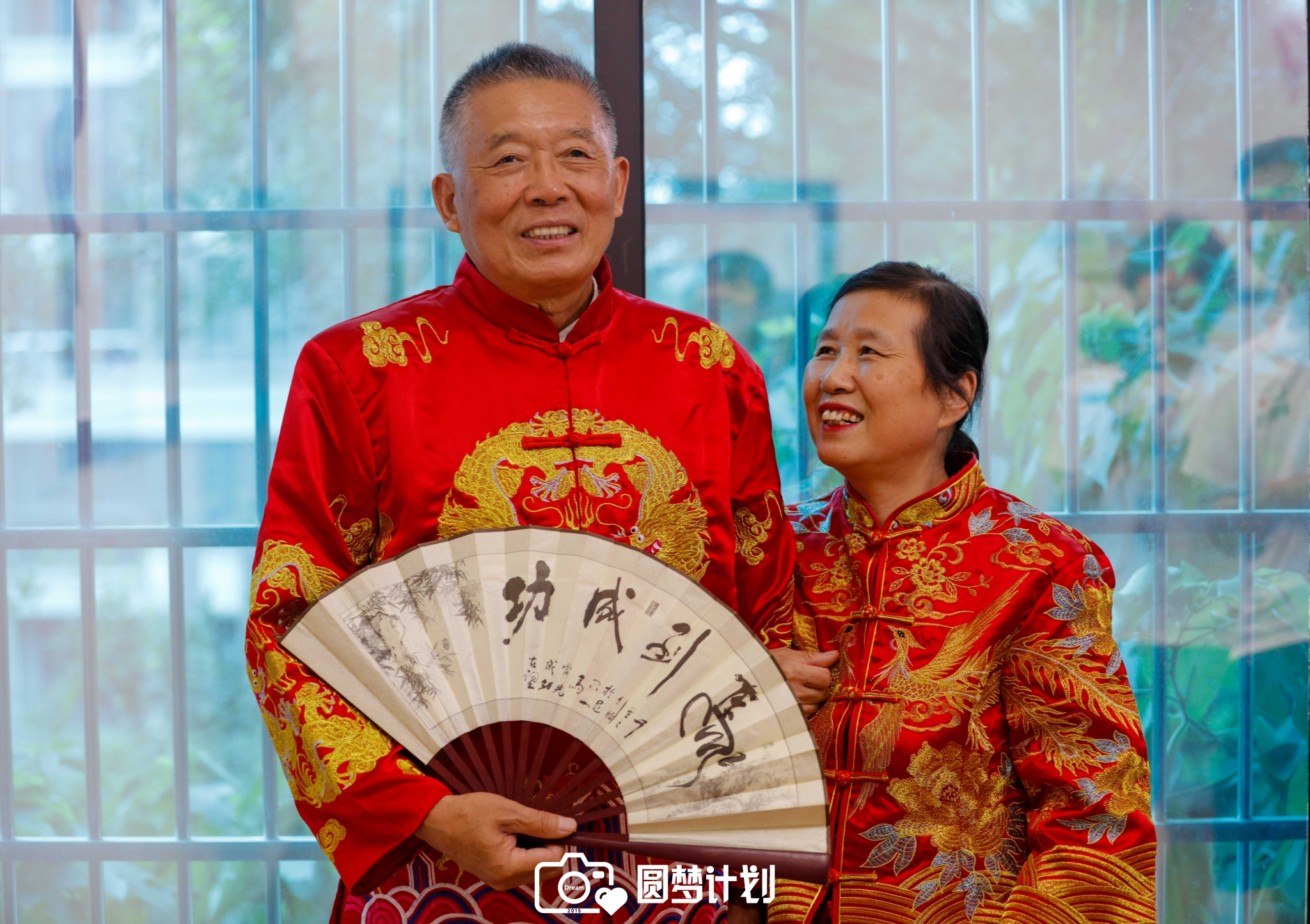 志愿者为老年夫妇化妆打扮,更换漂亮的婚纱、旗袍,穿上帅气的西服,他们在摄影师的指导下,摆出各种优雅浪漫的姿势,随着相机快门一次次响起,一个个幸福的瞬间被镜头定格下来。