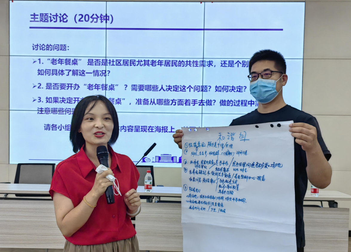 中华女子学院教授李敏将50多位社区工作者分成6组,大家展开了热烈的讨论。“老年餐桌”是否是社区居民尤其老年居民的共性需求?如何具体了解这一情况?开办“老年餐桌”需要哪些人决定?如果决定开办,需要从哪些方面着手去做?做的过程中又该注意哪些问题?