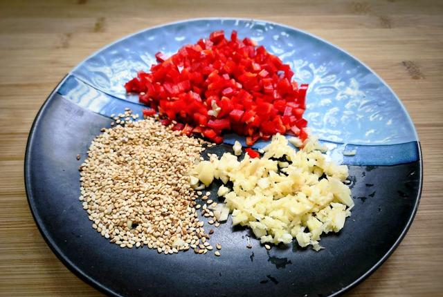 6、红椒去根洗净切成小丁,蒜粒剥皮切成蒜末,再准备点白芝麻。