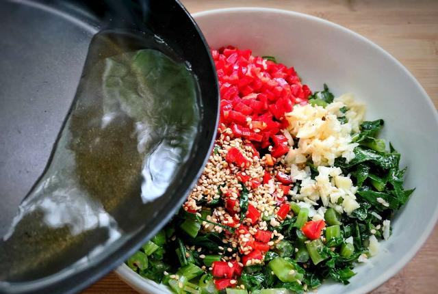 7、蒜末,辣椒红椒粒,芝麻放入萝卜叶上,锅中倒适量油,烧至冒烟,趁热将油浇在芝麻蒜末上。