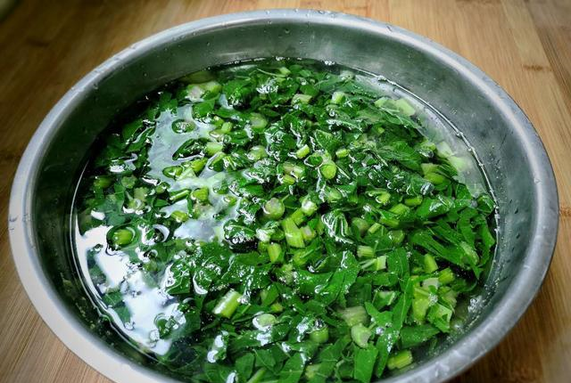 5、捞出萝卜叶放入凉水中过一遍,挤干水分,装入盆中。