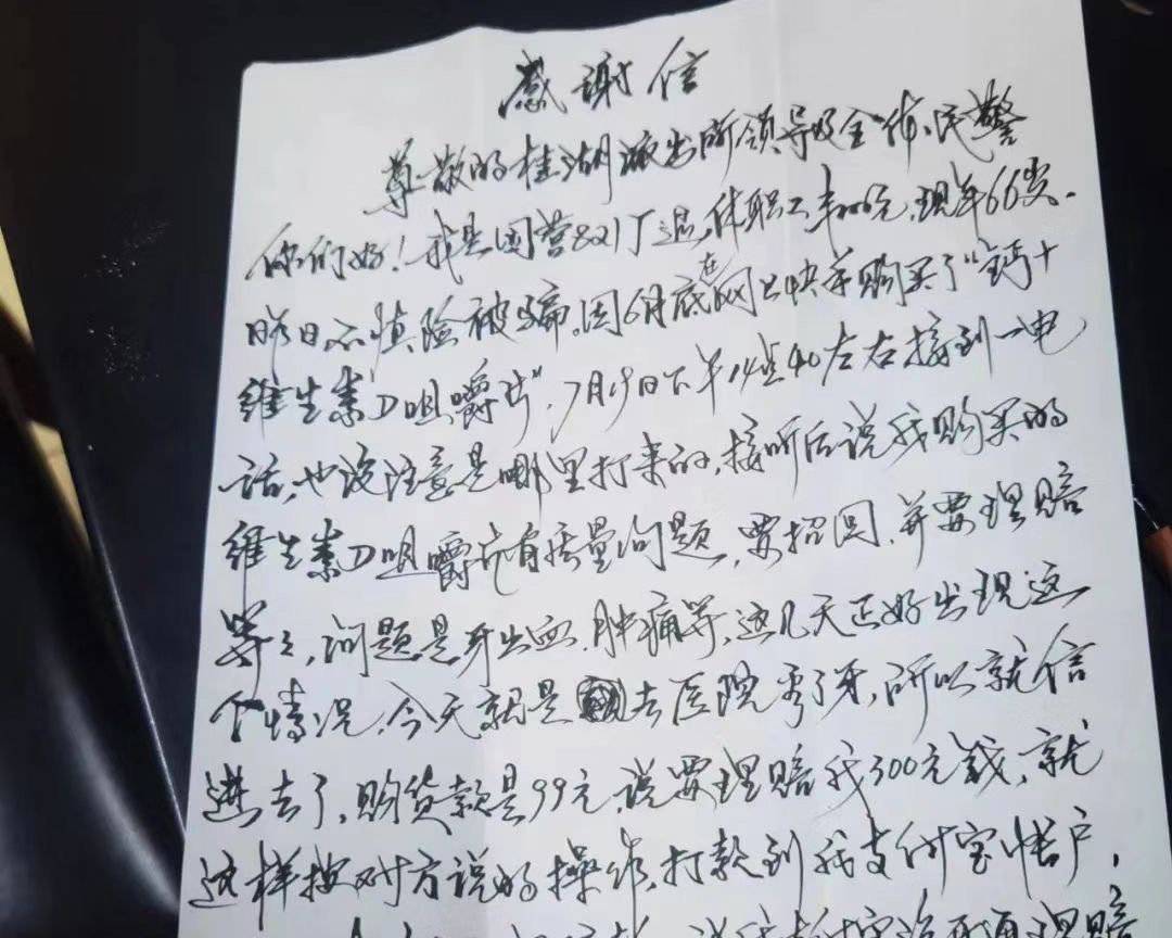 近日,一位头发花白的老人走进成都市公安局新都区分局桂湖派出所,他颤颤巍巍地将一个红色信封交到值班民警手中,嘴里不断念叨着“感谢警察,感谢你们。”信封里,是一封感谢信,老人写下了自己前些天差点被骗的经历,并向帮助他的民警表示了感谢。