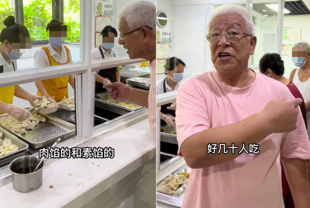 在领饺子之际,张洪杰热情和后厨人员交流,询问饺子都有什么馅,每人是不是限定领取。最后得知荤素都有,而且饺子个个都是后厨人员亲手包的,连连感叹此举非常好,很多老人都在这里吃。