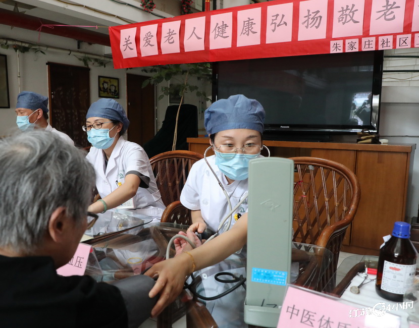 8月11日,苏州市姑苏区金阊街道朱家庄卫生服务站的医务人员冒着高温天气来到苏州市金阊老年公寓,为这里的老人提供免费的家庭医生签约、测量血压、用药咨询以及中医药养生指导等爱心服务。特约摄影 杭兴微