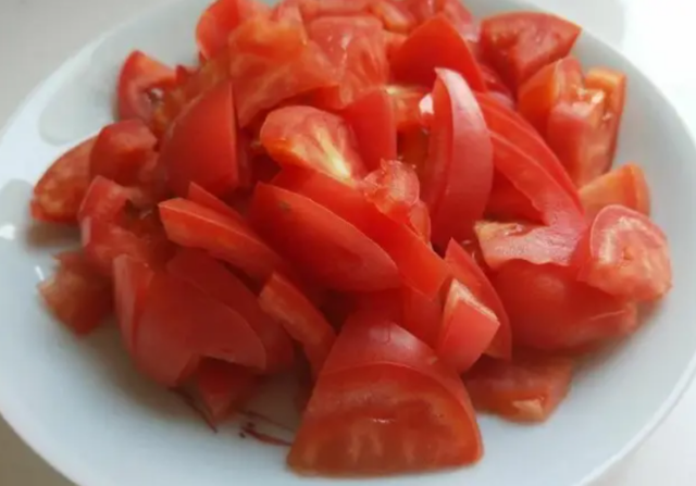 ①将南瓜去皮切成小方块、番茄去皮切成与南瓜大小相似的块状、大葱切成葱花(只要葱白)