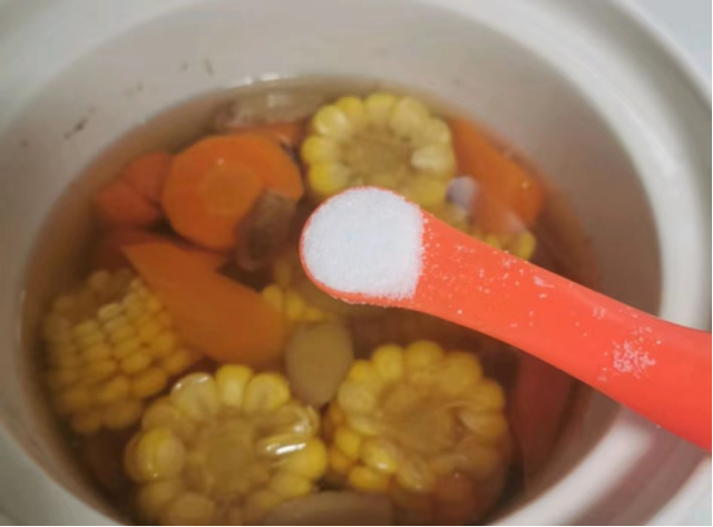 ④盖上锅盖,开始慢熬,熬到排骨用筷子可以戳透即可!出锅时,加入适量盐调味,排骨玉米胡萝卜汤就做好了!