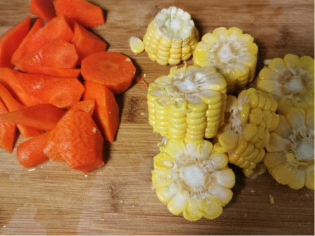 ②焯水后捞出清洗干净备用。将胡萝卜削皮切块,将玉米切段。