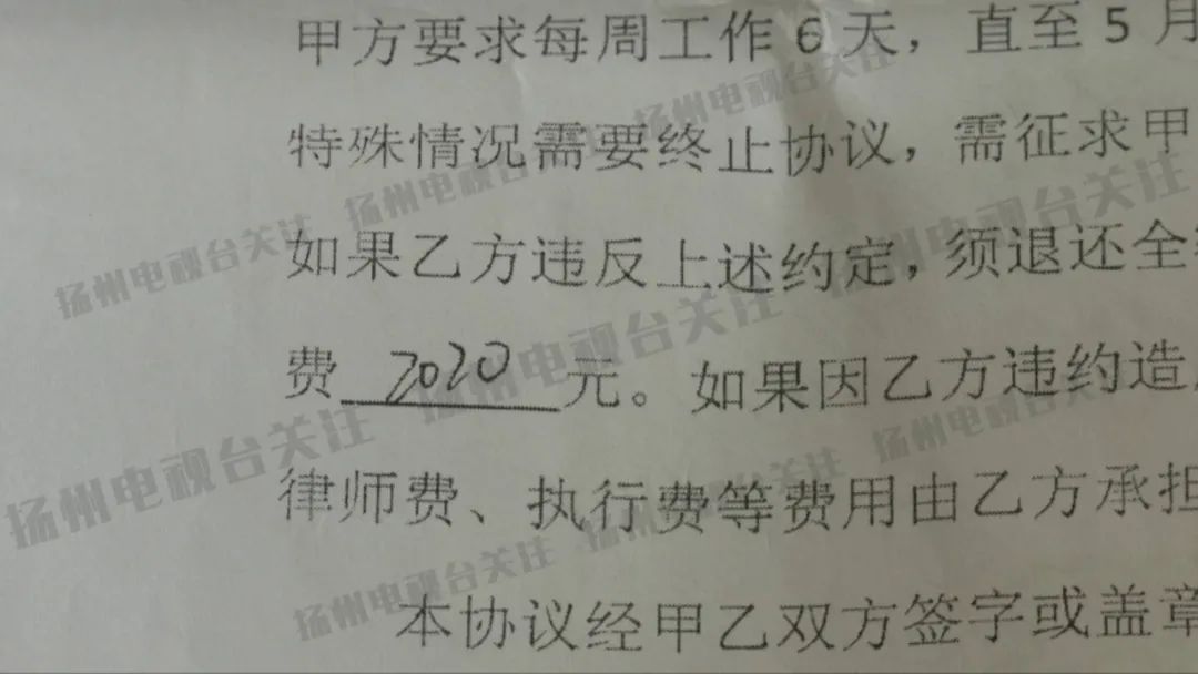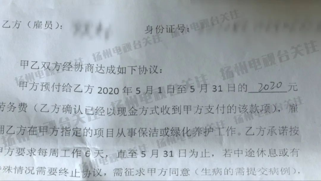 记者查看顾师傅提供的材料,发现双方签的是一份劳务协议,上面写明:顾师傅他们确认以现金方式收取了曹某预付的2020年5月1号到5月31号的劳务费,每人2020元。但几位老人坚称,对方支付的是欠薪,并且指责曹某在协议上动了手脚。