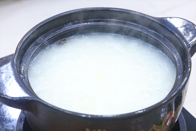 3.砂锅中加入大半锅清水大火烧开,水烧开后把大米倒入砂锅中,米和水的比例为1:7,再淋入适量的植物油增加香味,沸腾后搅动一下锅底以免粘锅,转为小火炖煮1个小时,炖煮期间不要盖锅盖以免溢锅。