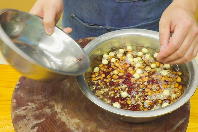 1.红芸豆、赤小豆、花豇豆、薏米、花生、莲子清洗干净挑出坏豆子;江米和红枣一起放入蒸锅内,用中火蒸30分钟,在蒸制江米加水的量没过江米一个指节即可。