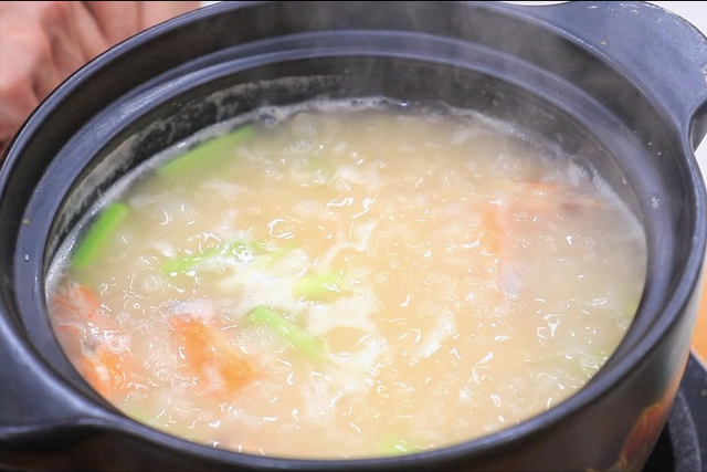 4.把虾仁、香菇、西兰花和胡萝卜倒入锅中,煮至米粥再次沸腾转为小火,开始调味。加入食盐3克、胡椒粉2克,继续熬制。