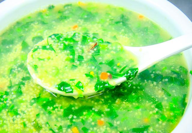 4.大约熬制3分钟,等小米熬开花以后,把芥兰倒入锅中搅拌均匀,继续煮至小米羹微微烧开,再勾入半勺芡粉,把小米羹调的稠一点,以免过于寡淡,再次煮开以后即可出锅。