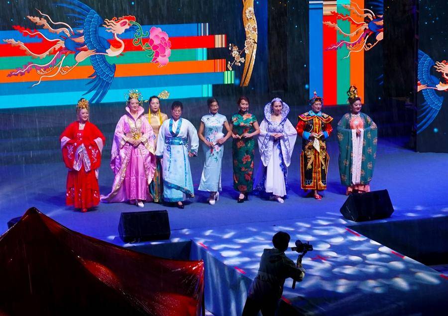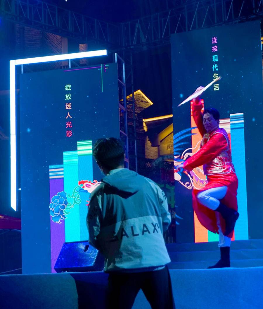 我一手打着伞,一手持相机,时而左边,时而右边,时而又蹲拍,时而又跑到高楼上俯拍整个会场画面。震天响的音乐,男女主持人激亢的话语,模特们的自信,华美的服饰,五彩的灯光,霏霏细雨,把会场渲染的格外美丽。现场极具震撼力和历史文化感染力。
