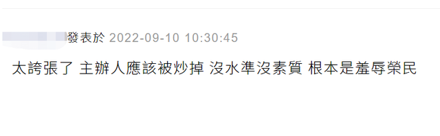 有网友认为“太夸张了”,活动主办人应该被炒掉,“没水平没素质。根本是羞辱‘荣民’。”↓