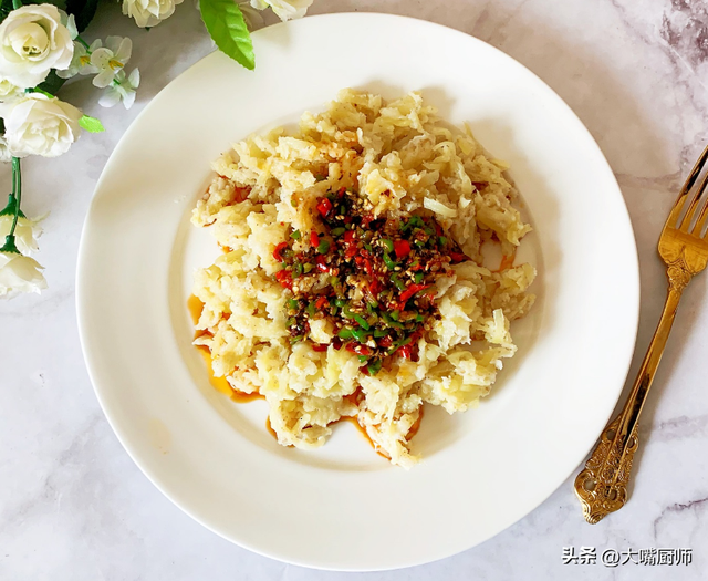 3、蒸锅加水烧开,铺上纱布,把土豆丝放在纱布上,盖上盖子蒸3分钟,变透明后去除,趁热用筷子抖散,放凉。