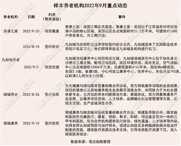 观点指数 9月,各企业在养老业务的拓展方向不变,既有企业新接管"公建民营"项目,也有与专科医院达成战略合作。