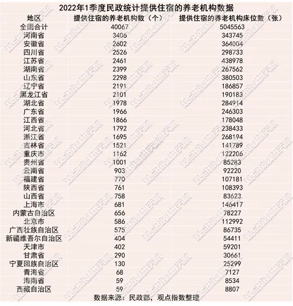 民政部最新数据显示,截至2022年第一季度,全国各类养老服务机构和设施达36万个,床位812.6万张,床位数是2012年底的近2倍。其中,提供住宿的养老机构数量达4万个,提供住宿的养老机构床位达504.6万张。