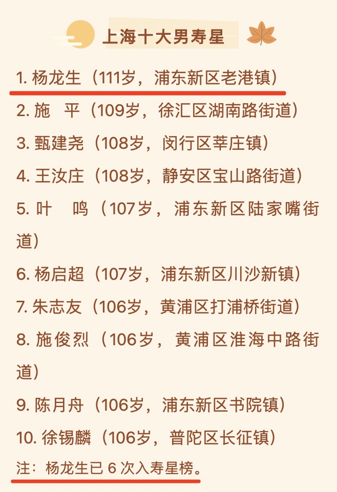 2022年敬老节,上海市民政局公布百岁寿星信息,现年111岁的杨龙生,成为沪上最高寿男寿星。杨老居住在浦东老港,这个常住人口仅为3.5万余人的小镇,目前百岁寿星达16名,每十万人中百岁寿星的比例,高于上海全市水平。