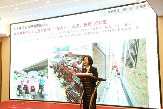 黄埔区红山街社区卫生服务中心护理站负责人罗岚对“红山·誉华扶老养老项目”进行了介绍,从家庭医生签约管理、康复护理、安宁疗护到医养结合,红山闭环的医养服务体系能为有困难的社区居民和老人提供及时、专业、持续的社区居家整合照护服务。