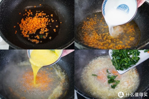 1、菠菜清洗干净切碎,胡萝卜清洗切碎倒入热油锅中翻炒1分钟左右,倒入一碗热水煮开。