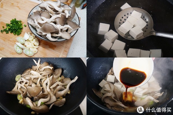 3、炒锅中加入适量的油,油热后倒入大葱、大蒜炒出香味,倒入平菇翻炒1分钟左右,倒入豆腐。