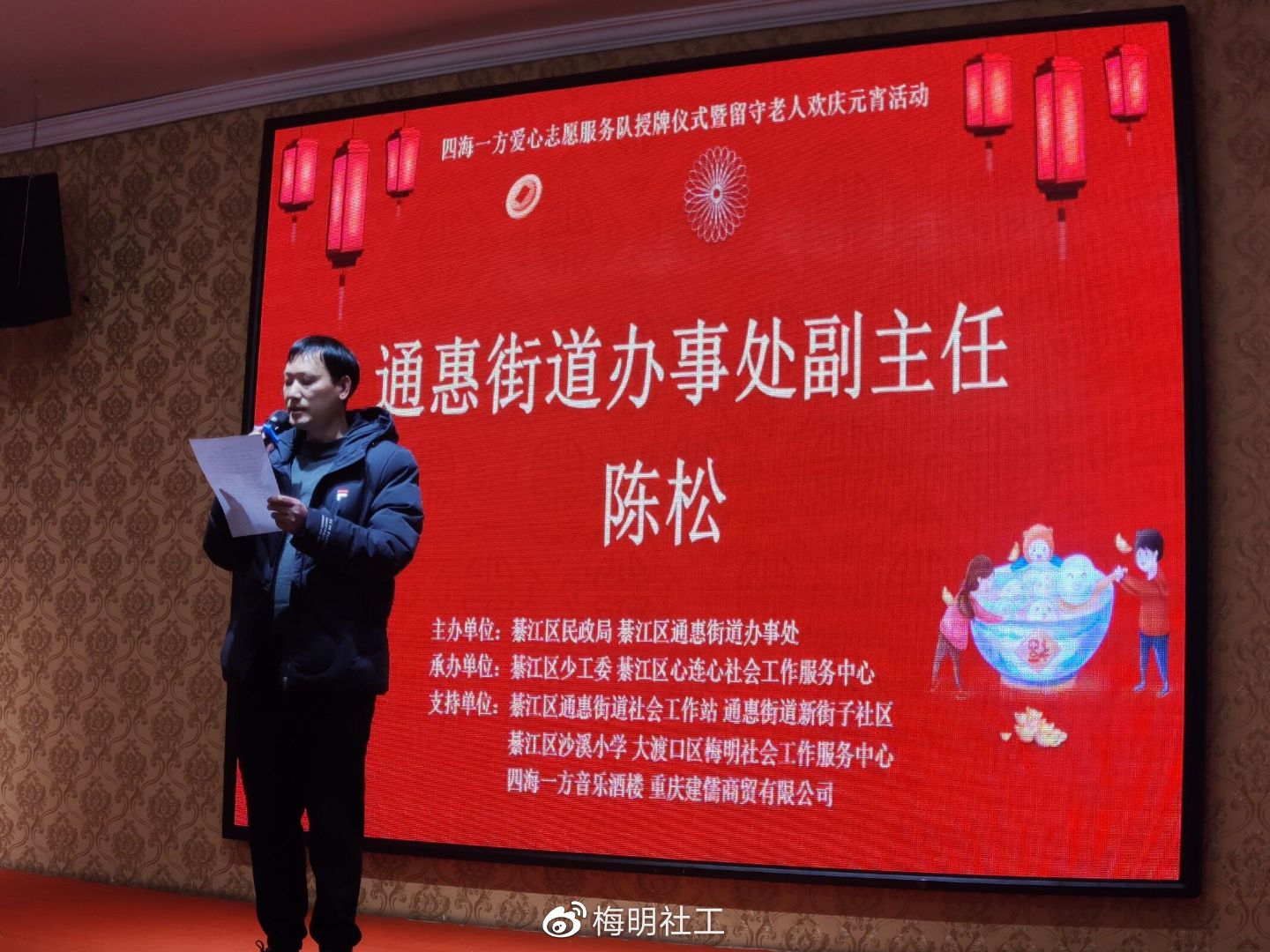 凝聚起贯彻党的二十大、奋进新征程的强大精神力量。元宵节来临之际,为了营造喜庆安康、昂扬向上的浓厚节日氛围,丰富特殊群体的精神文化生活。2月4日,在重庆市綦江区民政局指导下,綦江区心连心社工、大渡口区梅明社工联合綦江区四海一方志愿服务队、重庆建儒商贸志愿服务队在四海一方音乐盛宴开展“我们的节日•元宵”关爱綦江区特殊困难老年人志愿服务活动。100余名特殊困难老人欢聚一堂,大家猜灯谜,观看文艺表演、吃团圆饭,共庆元宵节。