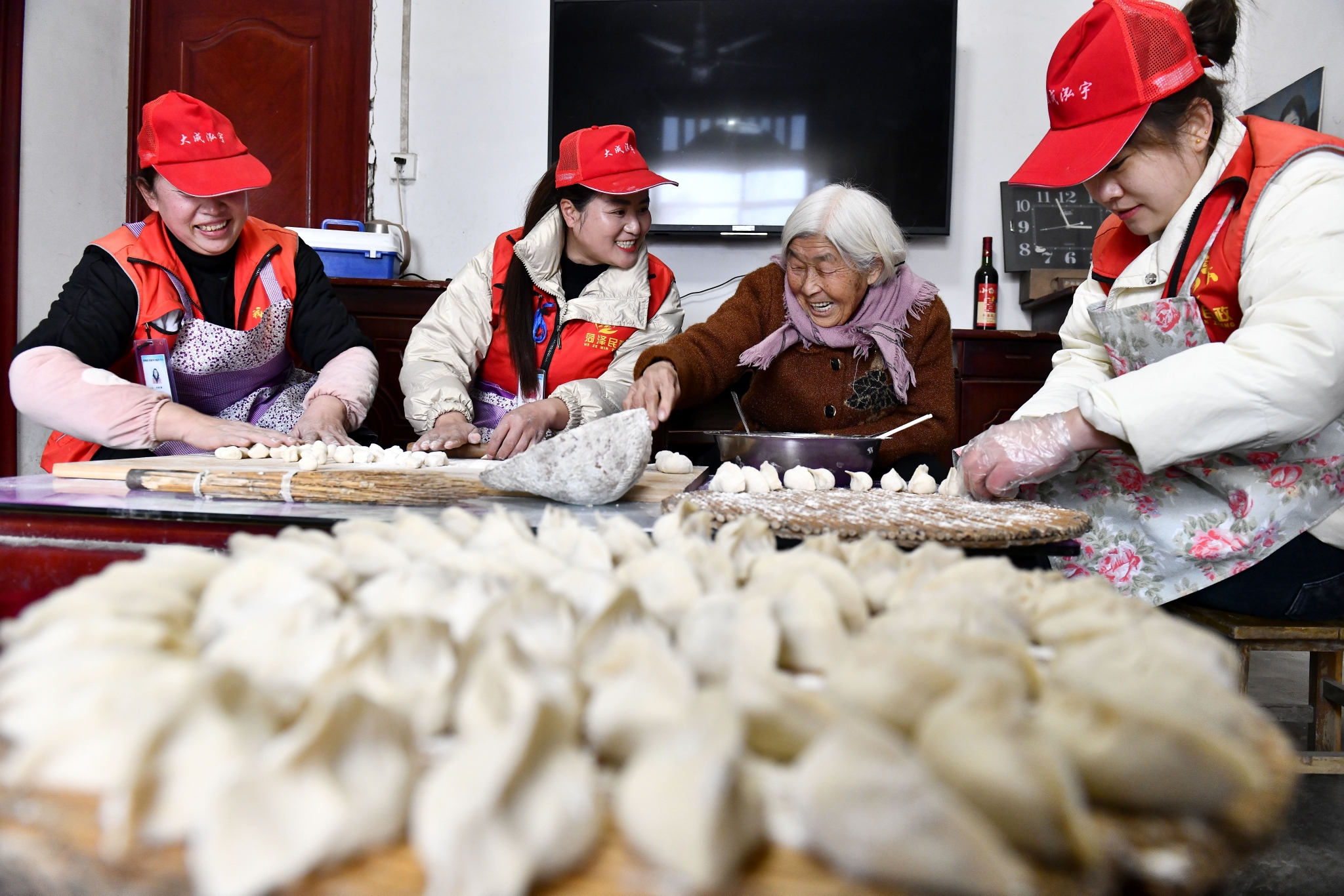 2月12日,在郓城县郓州街道王沙湾村,郓城县居家养老服务中心的工作人员和魏金兰(右二)老人一起包饺子。 新华社记者 郭绪雷摄