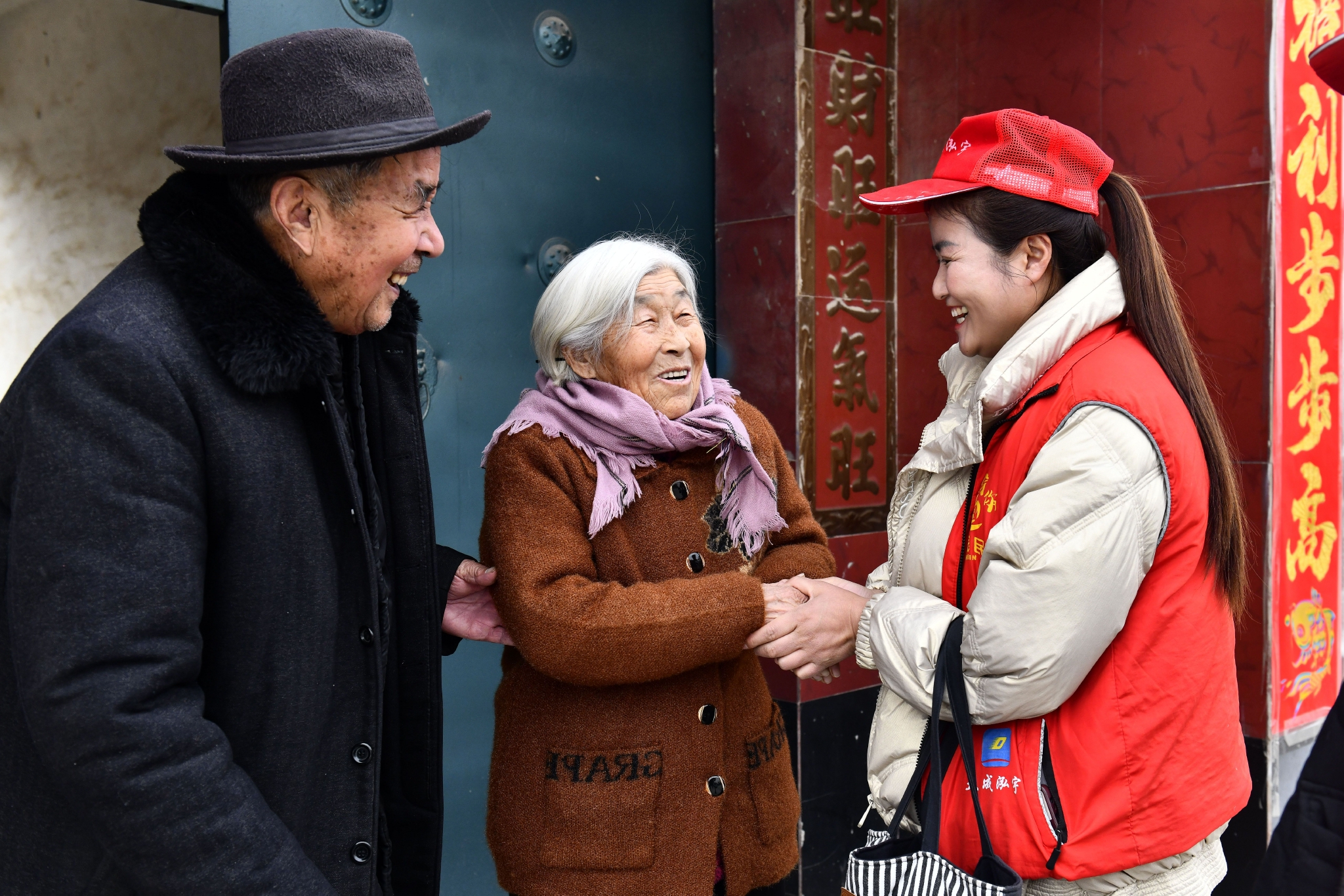 2月12日,在郓城县郓州街道王沙湾村,沈宜明和魏金兰(中)在门口迎接郓城县居家养老服务中心工作人员祝秀花。新华社记者 郭绪雷摄