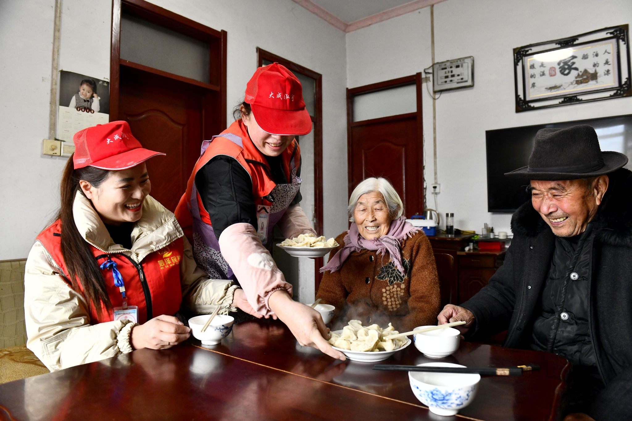 2月12日,在郓城县郓州街道王沙湾村,郓城县居家养老服务中心的工作人员为魏金兰(右二)、沈宜明(右一)端上饺子。 新华社记者 郭绪雷摄