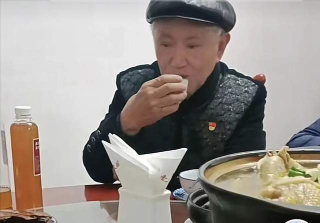 牛犇戴着黑色皮帽,全身上下穿着很保暖,胸前戴了徽章。两鬓斑白,脸上很多皱纹,弓着背。用筷子夹菜时一双手颤颤巍巍,吃饭时动作缓慢。一个人随着年龄的增长各方面都会发生变化,这是自然规律,没有人能够一直保持在年轻时那般。说到底,他已经近90岁的老人了。不过,话又说回,这么高龄保持这样的状态已经很不错了,还可以外出与友人相聚。