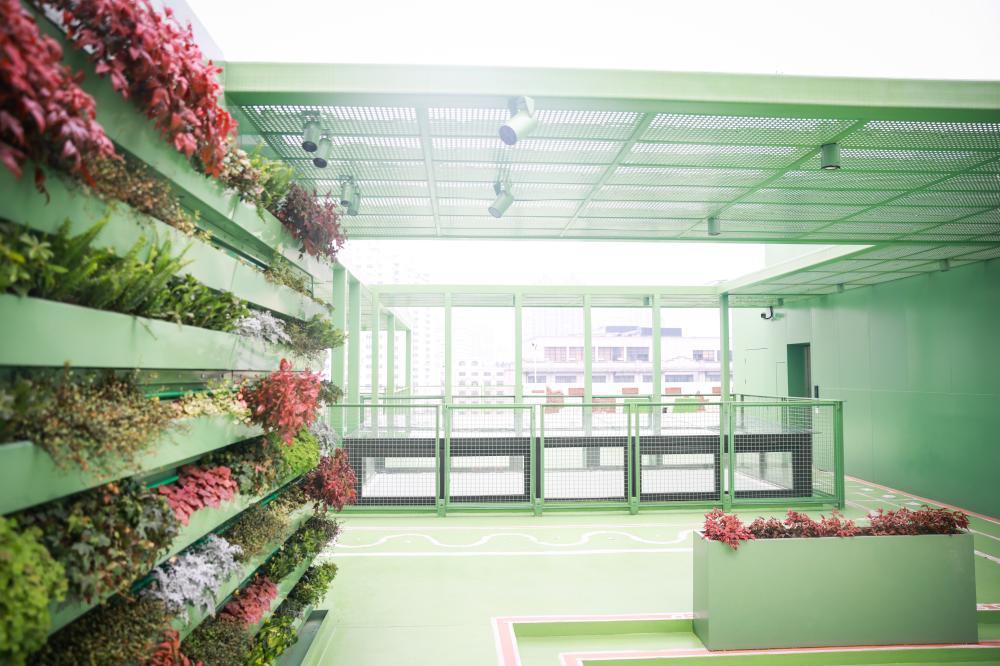 屋顶,更是别有洞天。从户外楼梯爬上去,感觉豁然开朗,这里是一处小型的屋顶运动场、小花园,也是最美瞭望苏州河的露台。屋顶的绿色地面上,画着跑道、游戏图等,一排休闲座椅正对着苏州河。