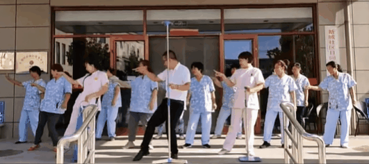 每天早上九点,古冶区怡然安养院老人们会三三两两来到养老院的大厅,等待着在华哥的带领下共同跳起这支舞。除此之外,《学习雷锋好榜样》《毛主席的书我最爱读》《打靶归来》《学猫叫》也是院儿里的热门单曲。