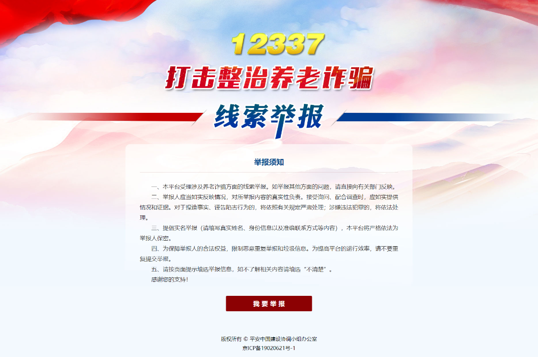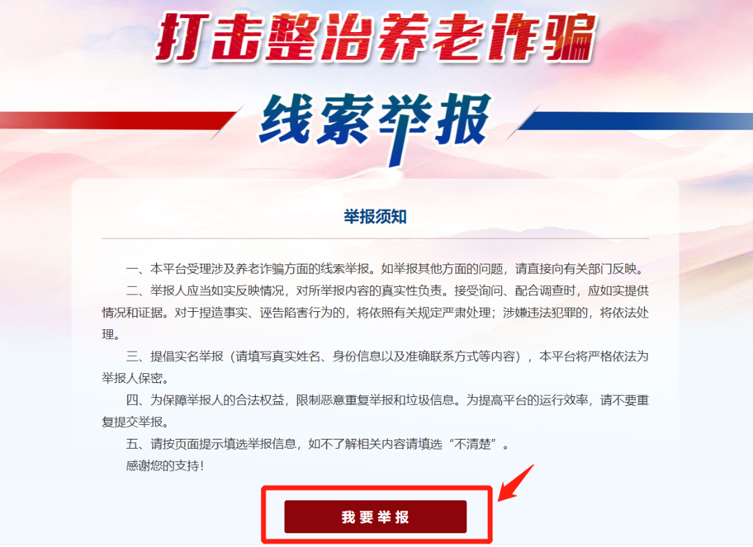 1.举报受理内容为涉及养老诈骗方面的线索。如举报其他方面的问题,请直接向有关部门反映。