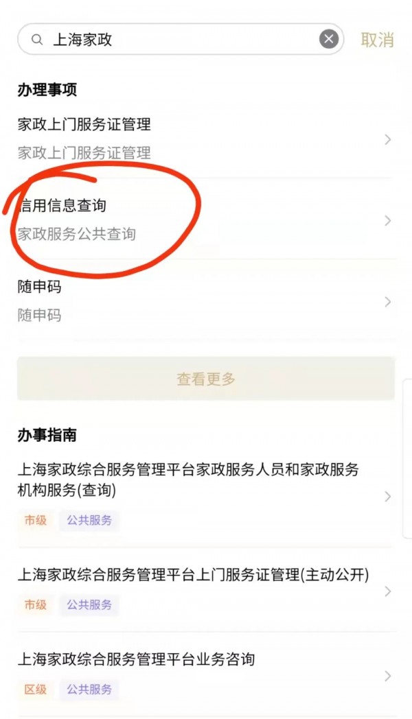 输入“上海家政”进行搜索后,点击进入“信用信息查询”。