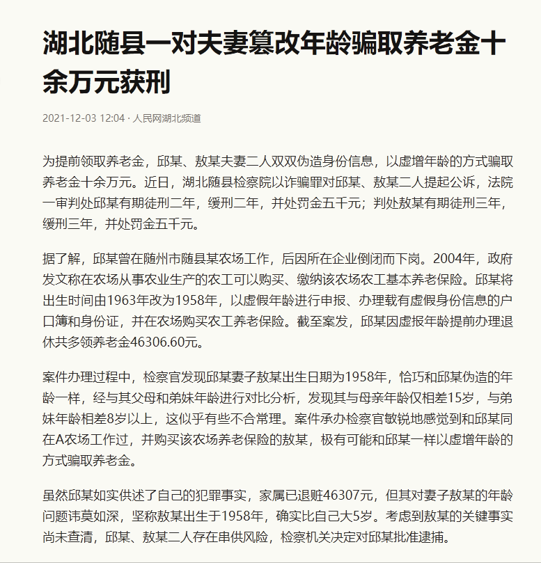 按照正常年龄参保,有的人可能因为参保时间晚,断缴,导致在退休年龄到达前,参保时间较短。这部分人为了能够多领养老金,选择修改实际年龄,提前参保,或者增加参保时间,对于这些人,被发现后,领到的钱也要再退还,比如去年年底,湖北睢县一对夫妇篡改年龄骗取10余万养老金,最后夫妻双双被公诉,最高被判处3年有期徒刑,两人各被罚款5000元,还需要退还赃款。在被判处服刑期间是不会发放养老金的,今年的养老金调整也将无法参加,服刑期满后再发放,也只能按照真实年龄计算养老金发放标准。
