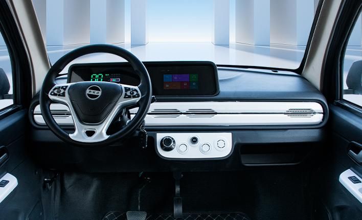 七牛电动小四轮中控台上配备了高清大屏MP5播放屏幕,采用连屏设计,左侧为液晶仪表盘,能够实时显示车辆的运行数据,包括车辆的实时速度、续航里程、剩余电量等等,右侧为高清多媒体MP5播放器,能够播放音乐视频,在倒车时还会显示实时的倒车影像。