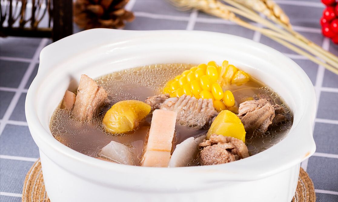 3、倒入适量的开水加入板栗和来玉米开始炖,大概40分钟左右,把切好的莲藕放进去开始炖,直至软烂。