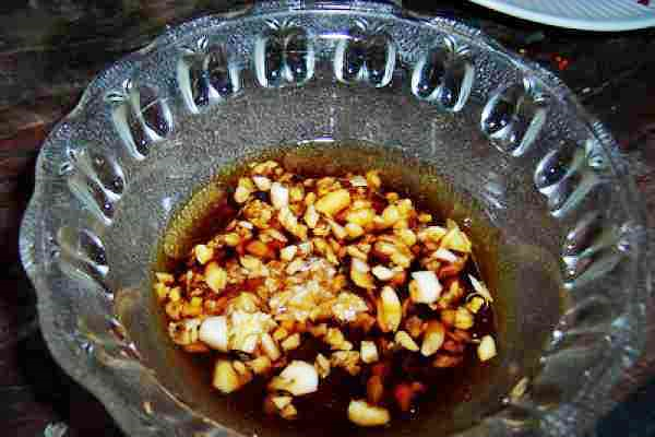 倒入适量六月鲜酱油、香油、盐、鸡精、香醋,调成蒜末酱油汁。