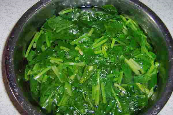 将菠菜段焯水。焯水后直接入冷水。