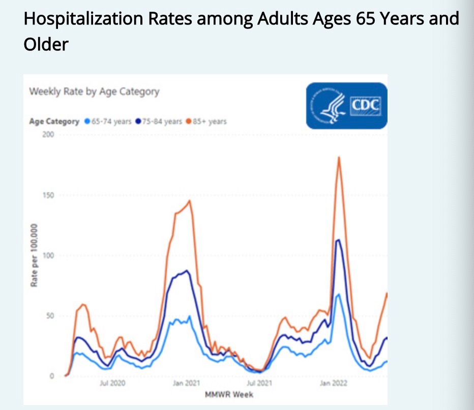 CDC表示美国新冠入院人数正在上升。2022年5月25日至31日的当前7天入院日均值是3789人,这比2022年5月18日至24日的前7天平均值3619人增加了4.7%。老人的入院率更是开始飙升。CDC数据显示,自2022年4月2日结束的那一周以来,65岁及以上的成年人的入院率,从4月2日的每10万人6.7人增加到5月14日的每10万人24.3人。在这一群体中,85岁及以上老年人的住院率增幅最大,从4月2日的每10万人14.8人增加到5月14日的每10万人中有68.7人。