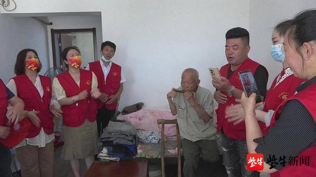 从小就喜欢音乐的何老爹爹生性开朗,看到这么多的志愿者在忙前忙后,还给他们送来清凉用品和过端午节的粽子,老人是异常的激动,拿出自己心爱的口琴,由他吹奏、志愿者伴唱了一曲《没有共产党就没有新中国》。