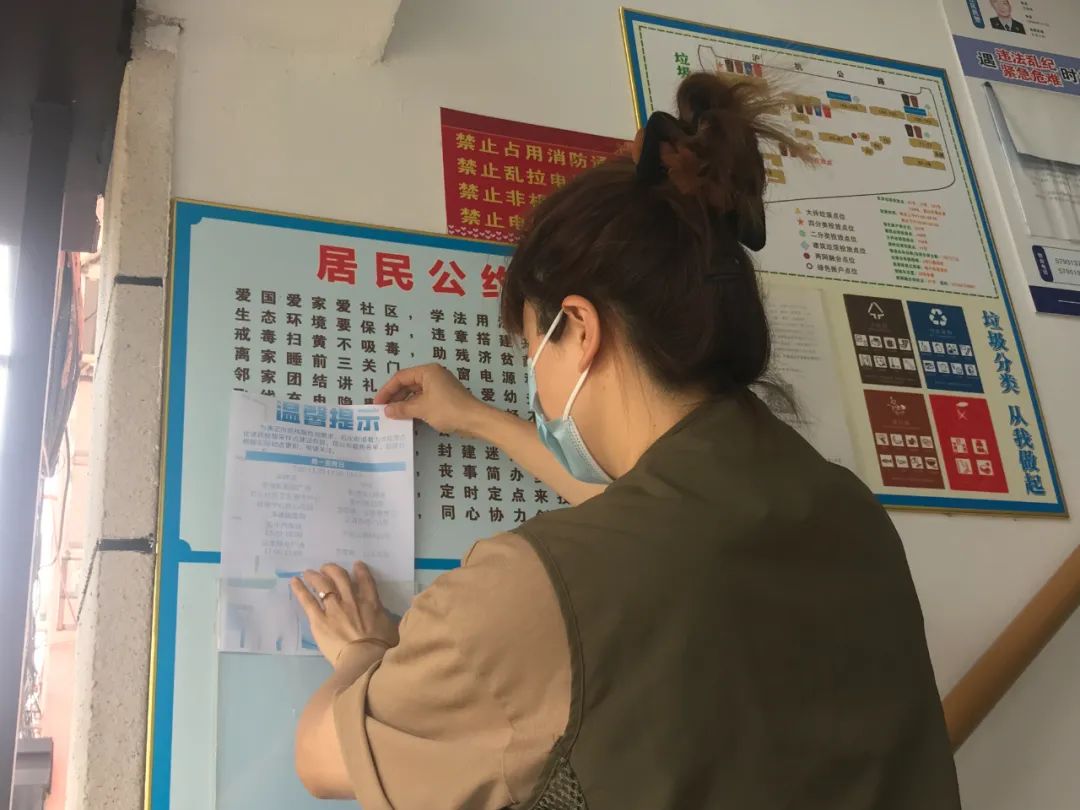 在石化十村居民区,居委会工作人员俞碧峰正在小区楼道、主干道以及公园旁等宣传栏里张贴常态化核酸采样点信息,居民可以查看核酸采样点的具体位置和开放时间,方便居民选择合适的点位就近进行核酸采样。